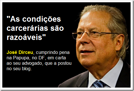 Acho que o juiz das execuções penais está nos enganando, pois para que o José Dirceu ache as condições carcerárias “razoáveis”, ele deve ter sido enviado para cumprir pena na Áustria, ou está enfurnado em alguma sala VIP da Papuda, onde os mortais não cumprem pena.